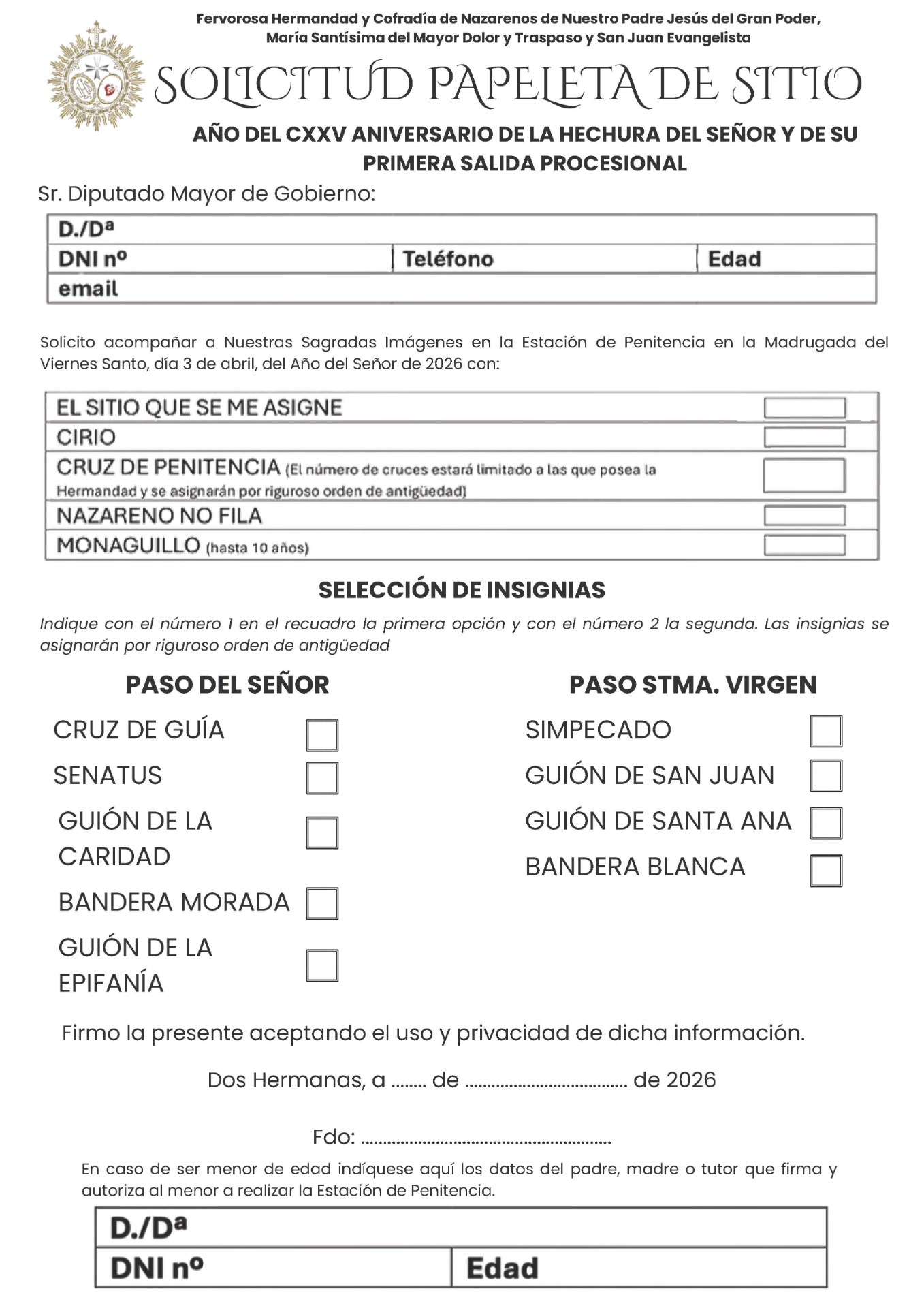 También puede descargar la solicitud bajo estas líneas, rellenarla y entregarla en la Casa Hermandad, o enviarla a través de email a: